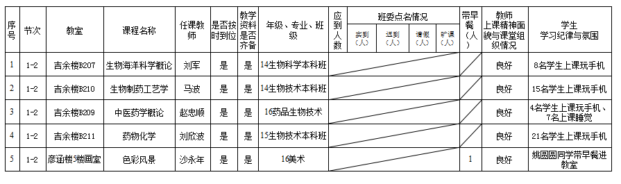 根据4月26日发布《连云港师范高等专科学校关于开展2017年教风学风建设专项督查工作的通知》(连师专〔2017〕33 号)精神,5月16日上午,教务处、学生工作处、督导室、人事处等部门组成联合督查组,继续深入教室开展督查。督查中发现,教风学风总体情况较好,教师按时到岗,上课认真,迟到、带早餐等不文明的行为有所减少,具体情况见下表。
