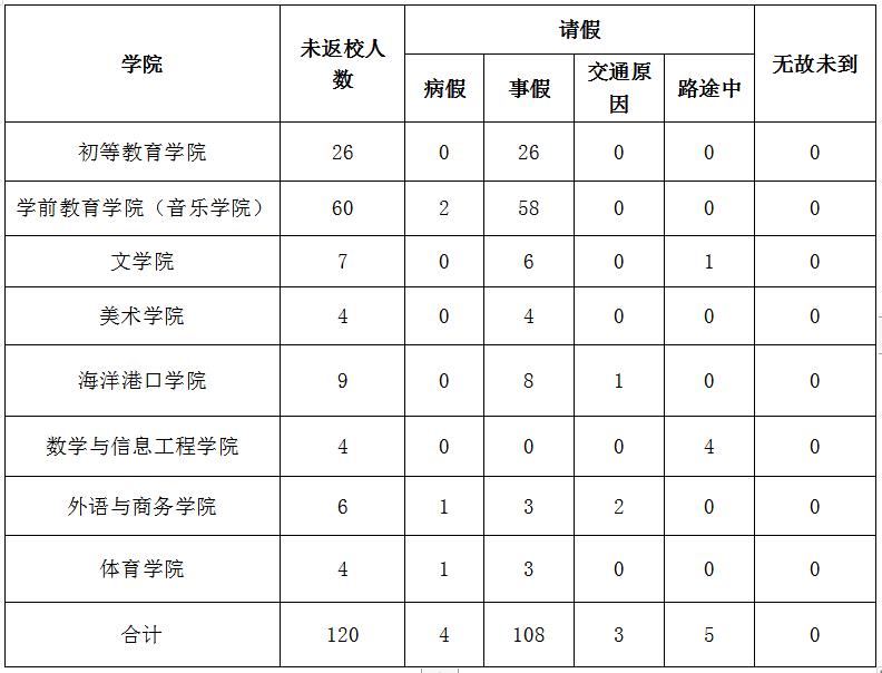 根据各学院报送的学生返校情况统计数据,截止到4月8日下午3点,除去在外实习学生,全校共有120人未返校,其中4人病假,108人事假,3人交通原因,5人路途中,0人无故未到。具体情况如下: