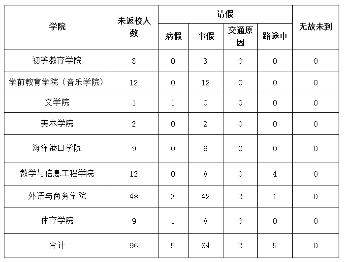 根据各学院报送的学生返校情况统计数据,截止到6月10日下午3点,除去在外实习学生,全校共有96人未返校,其中5人病假,84人事假,2人交通原因,5人路途中,0人无故未到。具体情况如下: