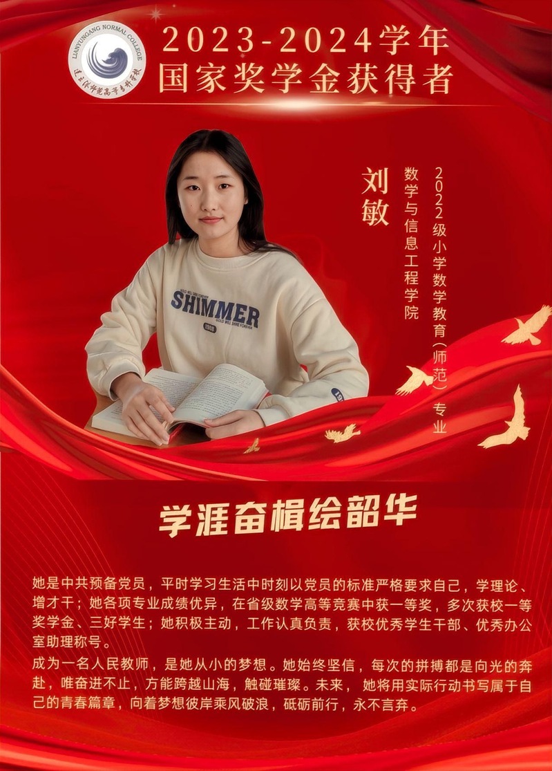 刘敏,女,汉族,中共预备党员,现为连云港师范学院数学与信息工程学院2022级小学数学教育(师范)1班团支书。学习成绩优异,在校期间,荣获省赛和市赛数学高等竞赛一等奖,荣获四次校“一等奖学金”和两次校“三号学生”,荣获“优秀学生干部”“优秀共青团员”等称号。